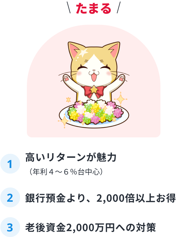 銀行預金・日本国債よりも、高い利回りを期待できます。 時代は「貯蓄から投資へ」。 銀行にお金を預けているだけの時代から投資が必要な時代に変化してきています。 将来の資産づくりの必要性に応えるのが「らくたま」です。 1万円から無理なくはじめることができます。