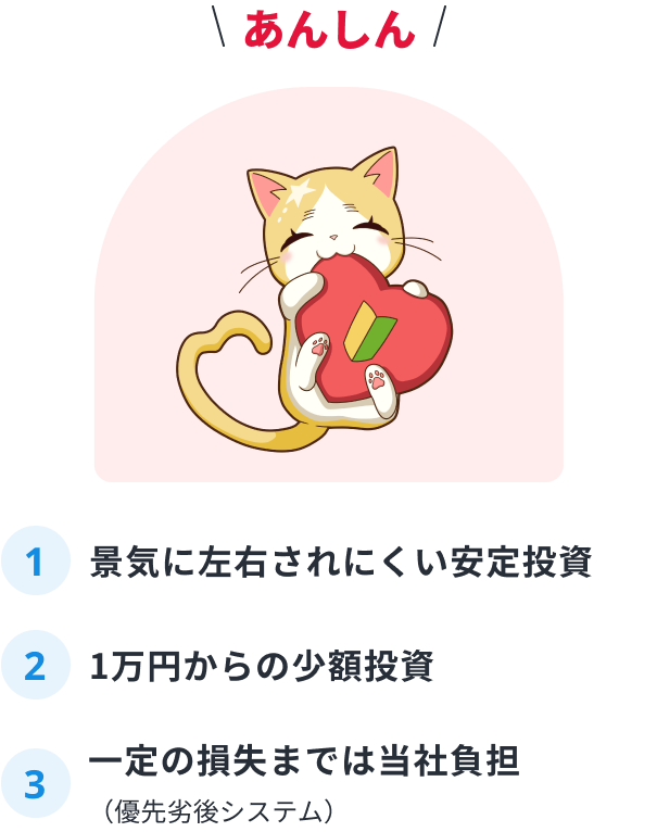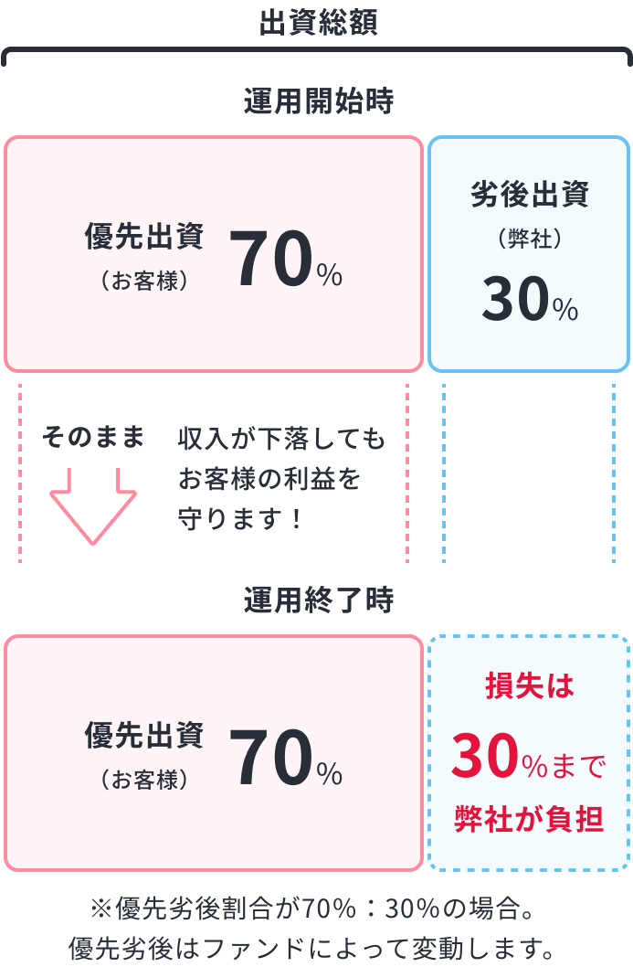 「らくたま」は、お客様の投資元本の安全性を優先的に守る「優先劣後システム」を採用しています。 物件の運用期間中や売却時に損失が発生した場合、「優先劣後システム」により劣後出資額までの損失については、劣後出資者である当社が負担するため、お客様の投資元本への影響はありません。