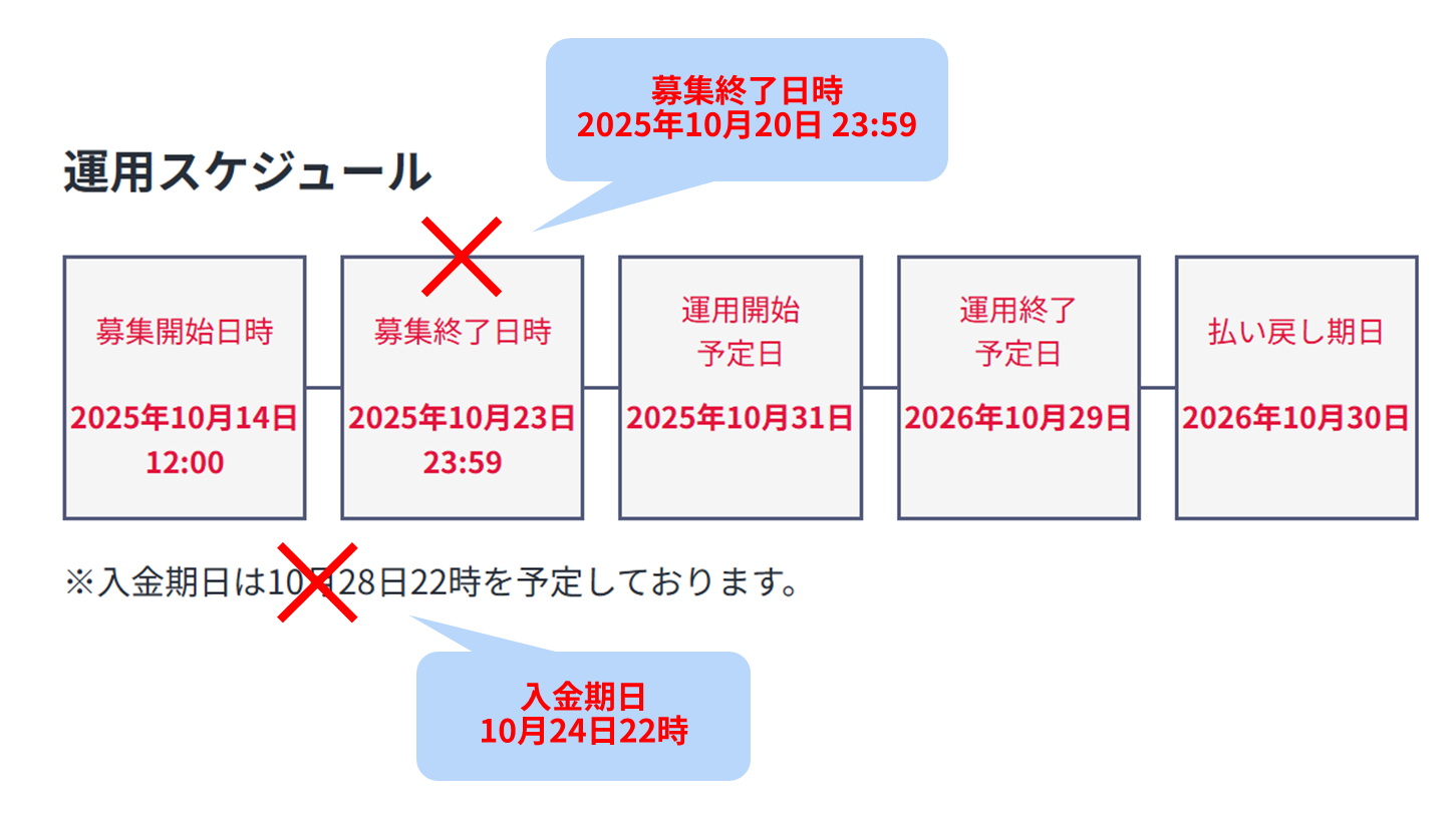(誤)募集終了日:10月23日 / 入金期日:10月28日(正)募集終了日:10月20日 / 入金期日:10月24日