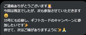 当選者さまだけでなく、落選された方からも温かい応援メッセージをいただきました…!