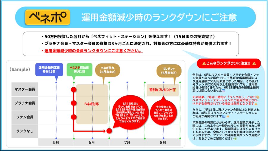 特に、現在開催中の「ベネポ2万円獲得限定ミッション(らくたま太っ腹大作戦)」に大口でご参加中の方の中には、2/15時点の運用金額によっては条件に届かなくなる可能性が生じます💦