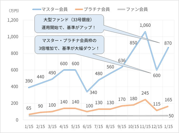 前回は、会員枠が3倍に拡大されることにより、運用金額水準の目安も✨ぐっと身近な水準✨になりましたが、12月に運用開始した大型ファンド(33号銀座)の影響により、再び運用金額の基準は上昇傾向となりました。
