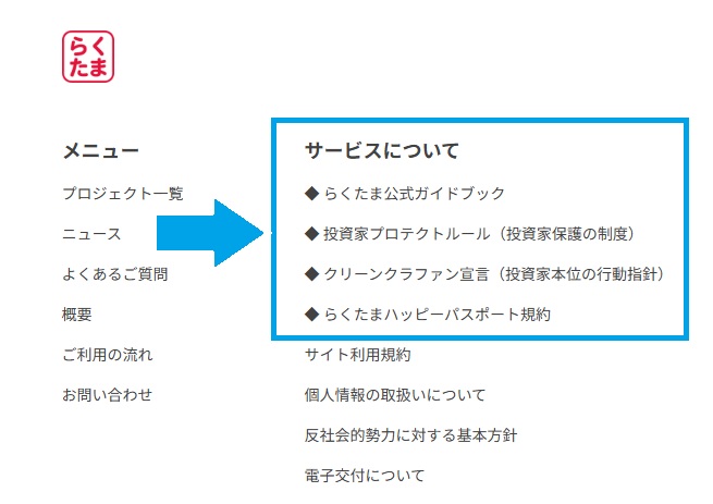 🔰 『らくたま』を徹底解説している『公式ガイドブック』🛡️ 資産を守るための『投資家プロテクトルール』✨ 私たちの姿勢をお伝えする『クリーンクラファン宣言』🎁 投資+αの楽しみが広がる『ハッピーパスポート』