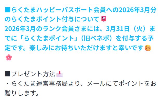 2026年3月のランク会員さまへ、3/31(火)【予定】に「らくたまポイント」(旧ベネポ)をお届け予定です🎁🪙✨