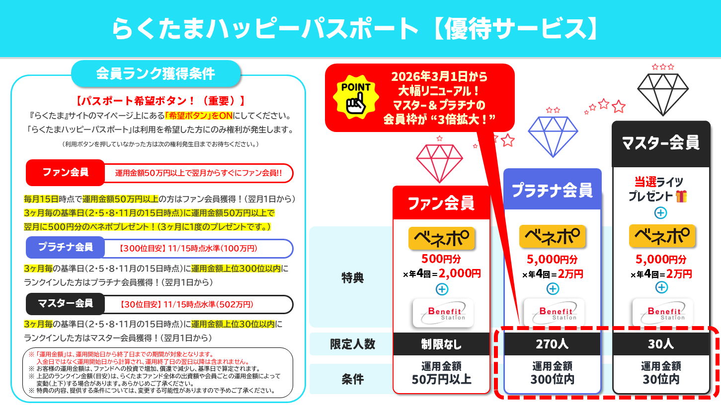 ベネポ2万円を受け取れる限定ミッション「らくたま太っ腹大作戦」(詳細は下記リリースをご参照ください)は、昨年12月2日より開始しております。本ミッションは、らくたま33号に100万円以上ご出資いただき、2026年2月15日時点でマスター/プラチナ会員(運用金額が上位300位以内)となった方を対象に、ベネポ2万円を追加で進呈するものです。なお、本ファンドへのご出資額は「らくたま ハッピーパスポート」の参加基準となる運用金額に合算されます。また、本ファンドは現時点では、2/15までにご参加いただける最後の大型ファンドとなる見込みです(※小型ファンドは1件組成予定)。ミッション参加をご検討中の方は、無理のない範囲でご検討いただけますと幸いです。PR TIMES https://prtimes.jp/main/html/rd/p/000000099.000116862.html