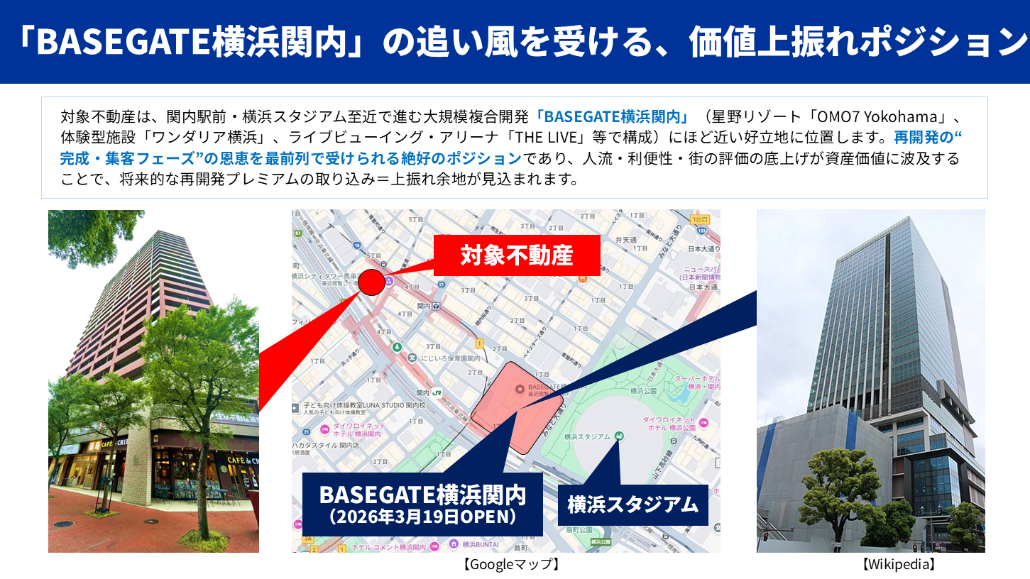 本ファンドは、JR「関内駅」徒歩1分の駅近立地にある分譲マンション「横浜シティタワー馬車道」23階(最上階・角部屋)1室を投資対象とします。駅前エリアでは、旧横浜市庁舎跡地で進む大規模複合開発「BASEGATE横浜関内」において、ホテル(星野リゾート「OMO7 Yokohama」)や体験型施設「ワンダリア横浜」、ライブビューイング・アリーナ「THE LIVE」など、街の“目的地”となる機能整備が進行しており、2026年春〜夏にかけて、関内の人流・賑わいが大きく変化する局面に入っています(※計画・工期等は変更の可能性があります)。さらに、関内駅北口・港町地区でも高層複合ビル建設を含む再開発が動き出しており、駅前一帯で都市機能と景観の刷新が同時進行しています。こうした再開発は、エリアのブランド力・集客力を底上げし、居住ニーズと投資ニーズの双方を押し上げやすい局面です。再開発が進むほど「駅前×最上階(角部屋)」という条件は希少性が高まりやすく、出口(売却)局面でも評価されやすい“強み”になります。街が更新されるタイミングを追い風に、中長期の資産価値向上余地が見込めるエリアへの投資機会として位置づけています。