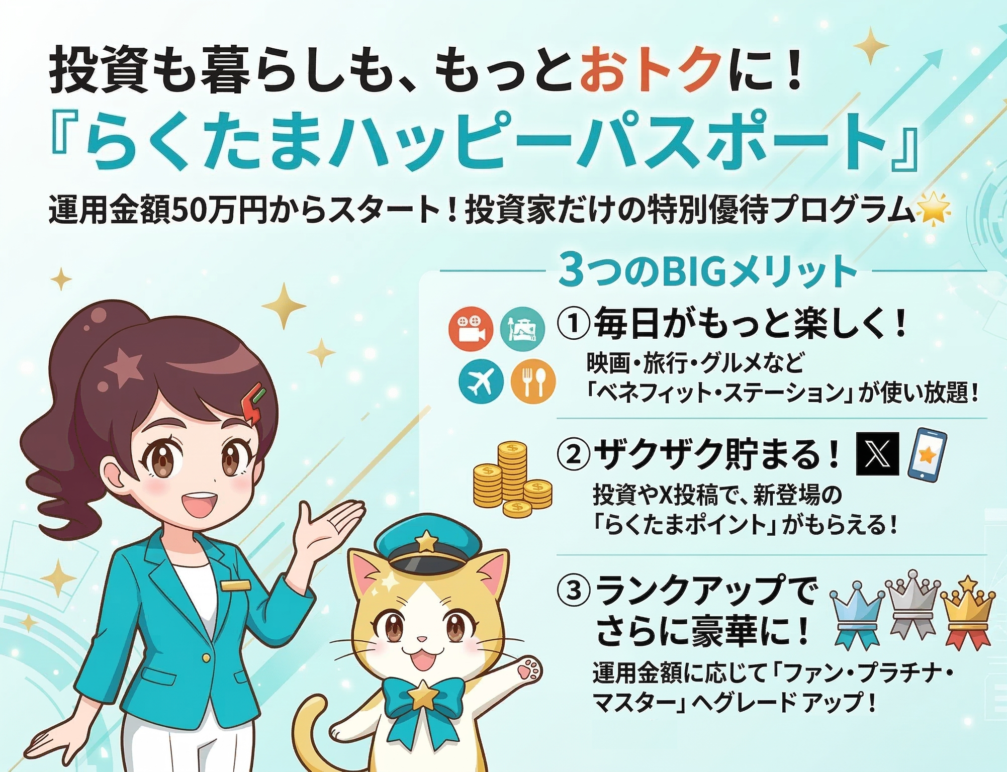 本ファンドへのご出資額は、「らくたま ハッピーパスポート」の参加基準となる運用金額に合算されます。現在の運用金額がゼロの方でも、本ファンドに50万円以上ご出資いただくことで、翌月または翌々月より、ベネフィット・ステーションの優待割引をご利用いただけるほか、3カ月に1度のらくたまポイントをお受け取りいただけます。詳しくは、下記のPDF資料「らくたま公式ガイドブック」をご覧ください。🔗 「らくたま公式ガイドブック」