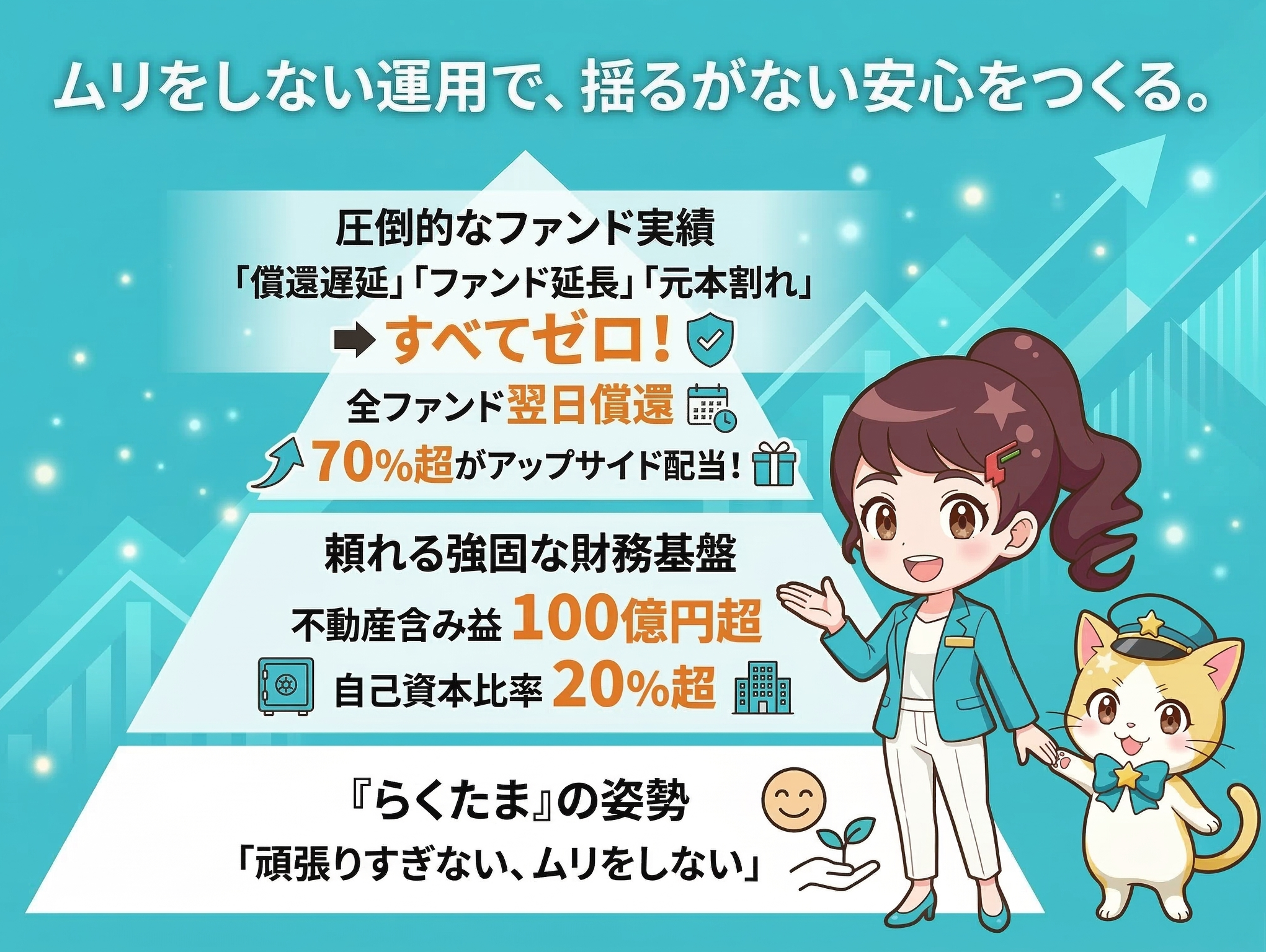 『らくたま』では、投資家資産の保全を最優先課題とし、当社の堅固な財務基盤と独自のファンド設計を融合させた新方針「投資家プロテクトルール」を発表いたしました。本ルールは5つの柱で構成され、どのような市場環境においても投資家資産を守り抜く堅牢な防御壁として機能する仕組みとなっています。「ファンド延長ゼロ」「償還遅延ゼロ」を実現するために、投資家プロテクトルールを導入し、投資家資産をより一層確実に保全する体制を確立しております。🔗 「投資家プロテクトルール」