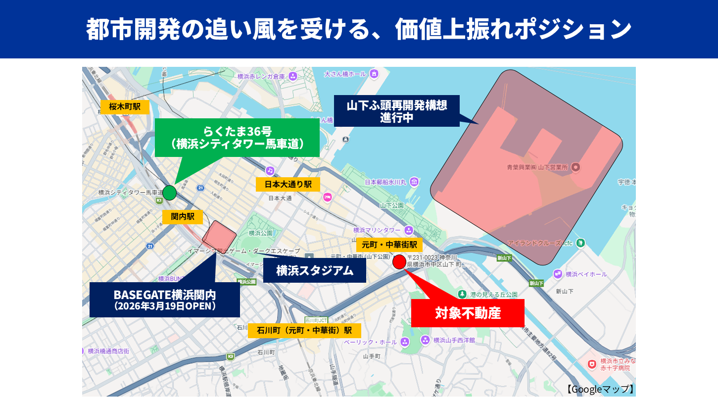さらに横浜都心臨海部では、関内駅前の大規模再開発や山下ふ頭再開発構想など都市機能の刷新を伴うプロジェクトが進められており、横浜中心部の都市価値向上が期待されています。こうした開発の動きはエリアのブランド力や居住ニーズの底上げにつながる可能性があり、本物件が位置するエリアもその恩恵を受ける立地といえます(※計画内容や時期は変更される可能性があります)。横浜ブランドと駅近立地を背景に、実需層・投資層双方からの需要が期待できる物件として、安定した出口戦略を見据えた投資機会として位置付けています。