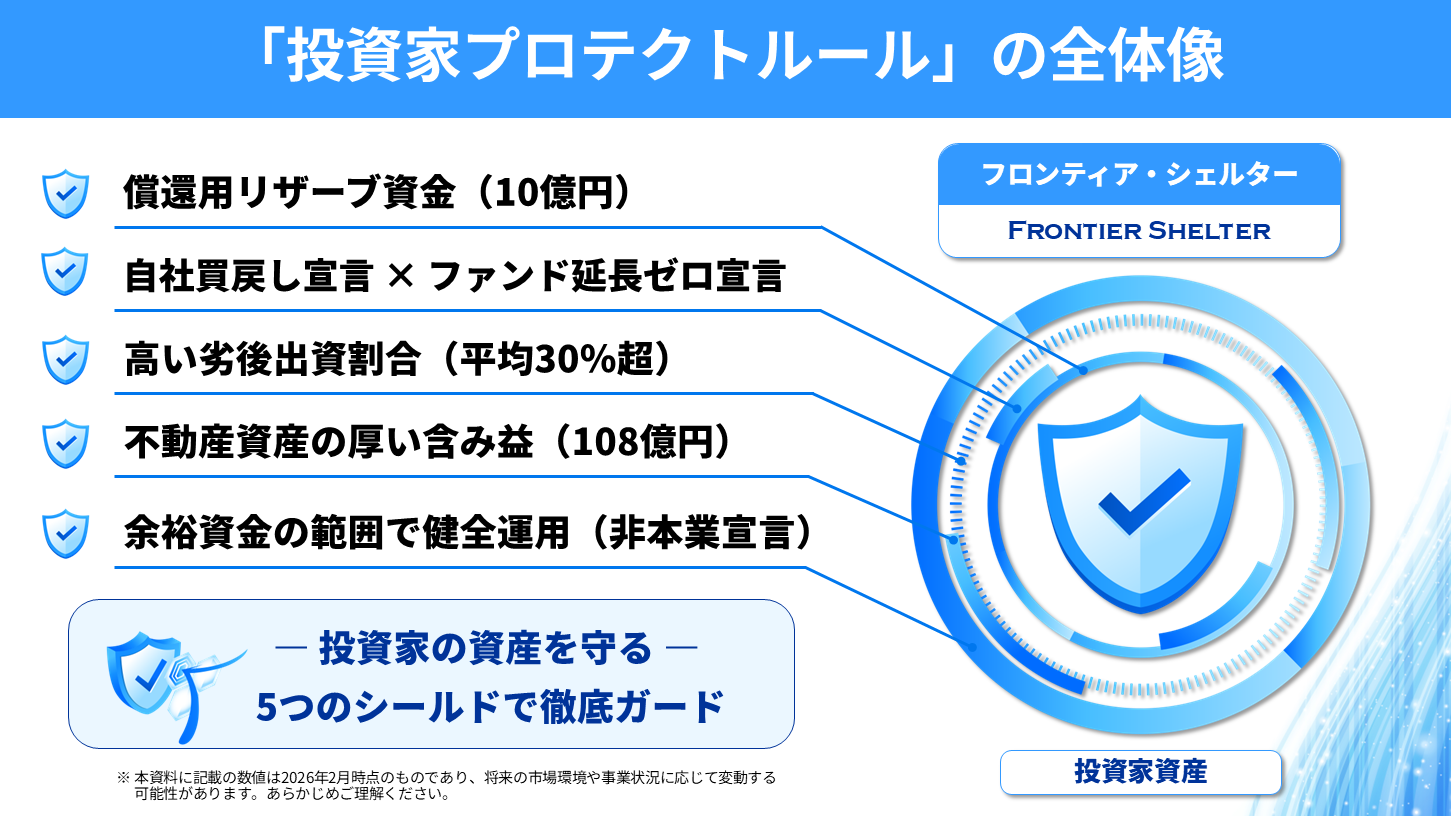 『らくたま』では、投資家資産の保全を最優先課題とし、当社の財務基盤と独自のファンド設計を融合させた「投資家プロテクトルール」を導入しています。本ルールは5つの柱で構成され、どのような市場環境においても投資家資産を守り抜く防御壁として機能します。「ファンド延長ゼロ」「償還遅延ゼロ」の実現に向け、投資家資産をより一層確実に保全する体制を確立しております。🔗 「投資家プロテクトルール」